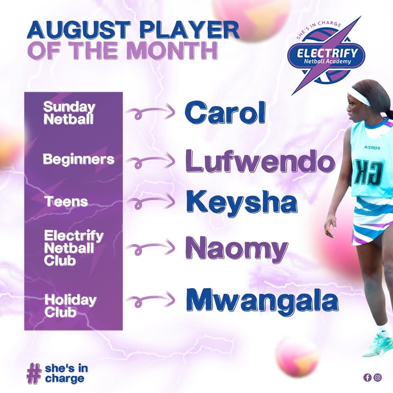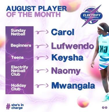 The August player of the month from Sunday Netball is Carol. The Beginners' player of the month is Lufwendo. The Teens' player of the month is Keysha. The Electrify Netball Club player of the month is Naomy. Lastly, the Holiday Club's player of the month is Mwangala.