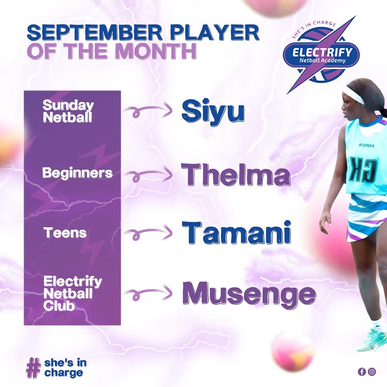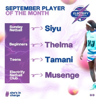 The September player of the month from Sunday Netball is Siyu. The Beginners' player of the month is Thelma. The Teens' player of the month is Tamani. Lastly, the Electrify Netball Club player of the month is Musenge.